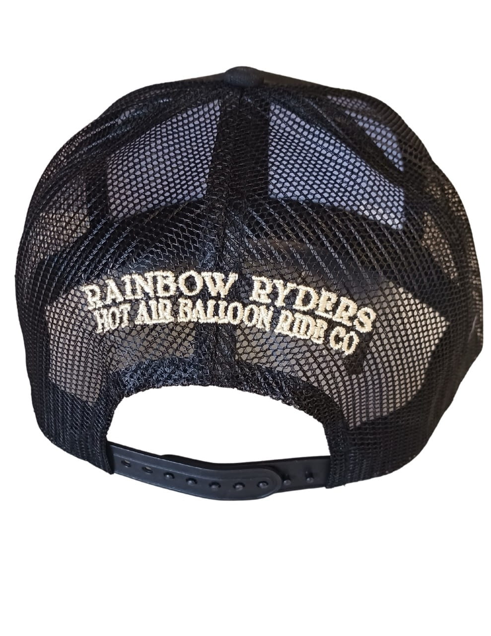 This hat boasts a front panel with a camouflage pattern and a unique New Mexico patch. It also features a breathable black mesh back with an adjustable snapback closure and embroidery that reads “Rainbow Ryders Hot Air Balloon Ride Co.”